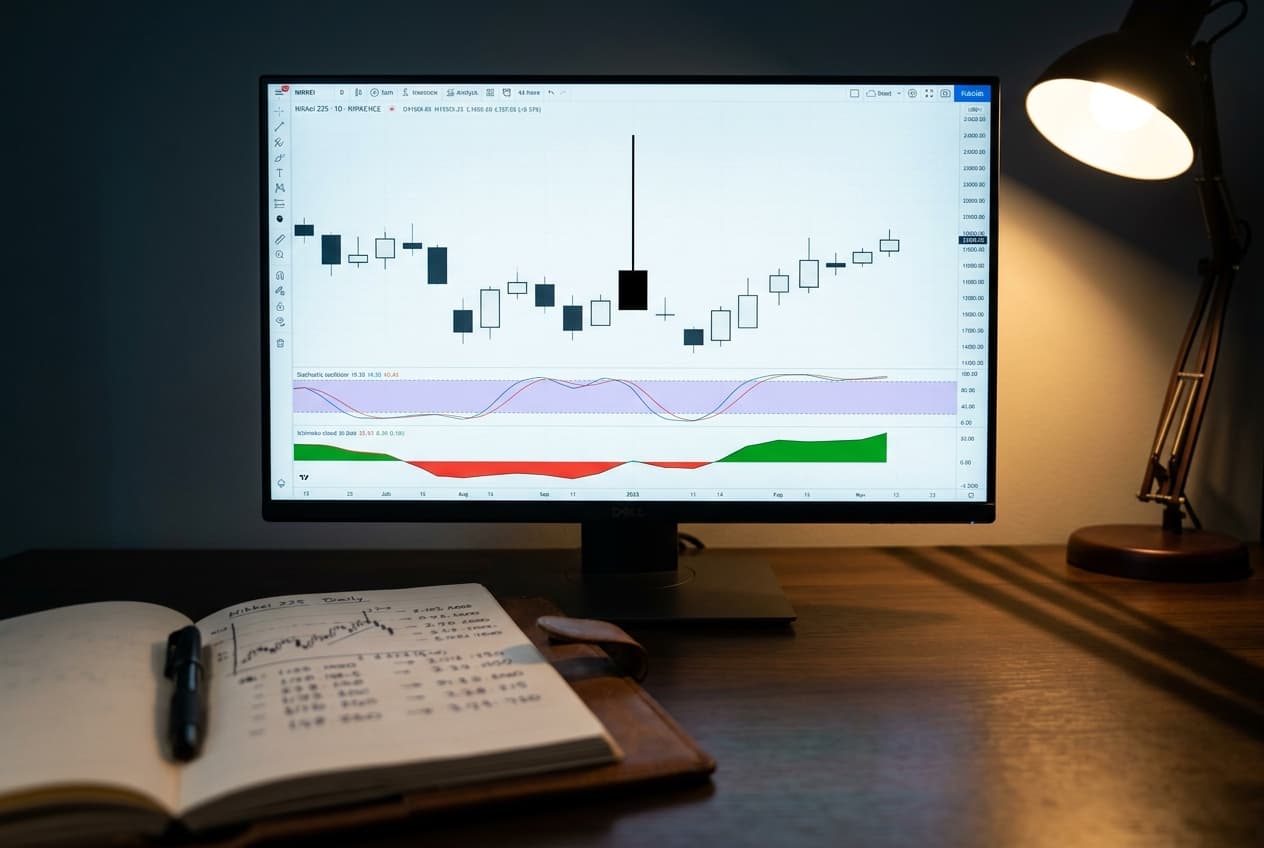 日経平均は4月15日、上ヒゲ321円の流れ星類似形状を形成しながらも小幅続伸し58,134円で引けました。MACDシグナル線がプラス圏に浮上し完全強気セットアップが完成、一目均衡表の雲も強気転換するなど中期強気シグナルは積み重なる一方、ストキャスティクス%K 94、SMA25乖離率+7.29%の過熱は短期調整リスクを警告しています。4月14日のランナウェイギャップ上端57,877円の維持が強気継続の死活ラインで、R2 58,806円突破が次の上昇トリガー。60日高値59,332円がいよいよ視野に入る局面です。